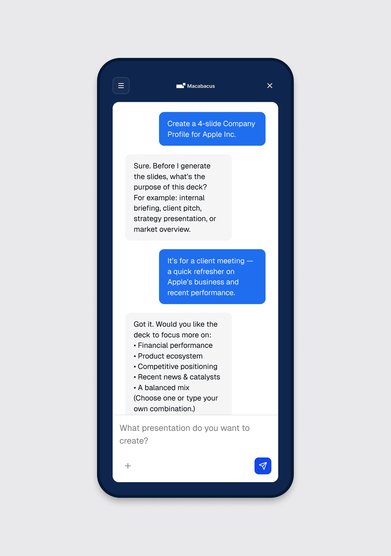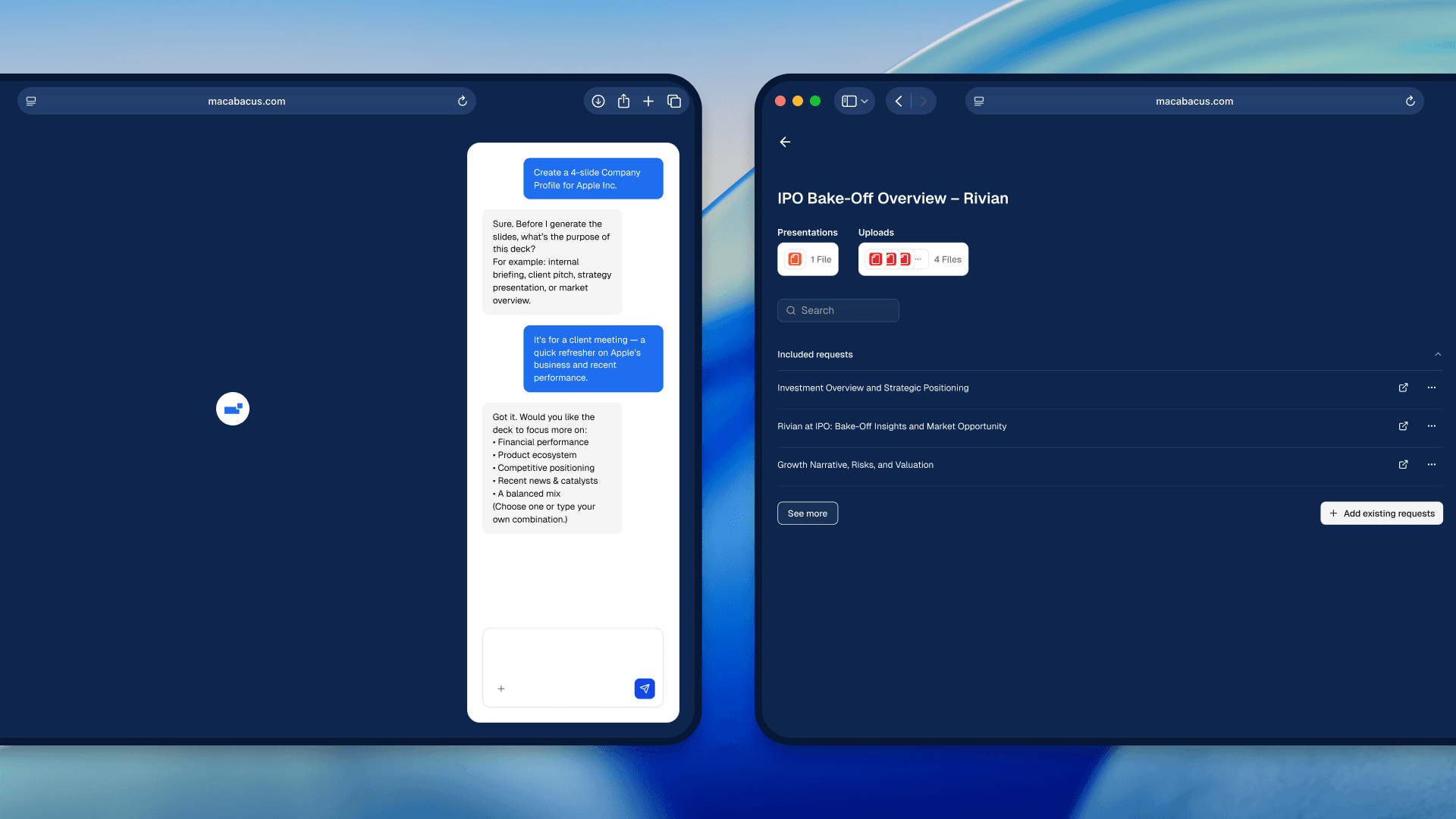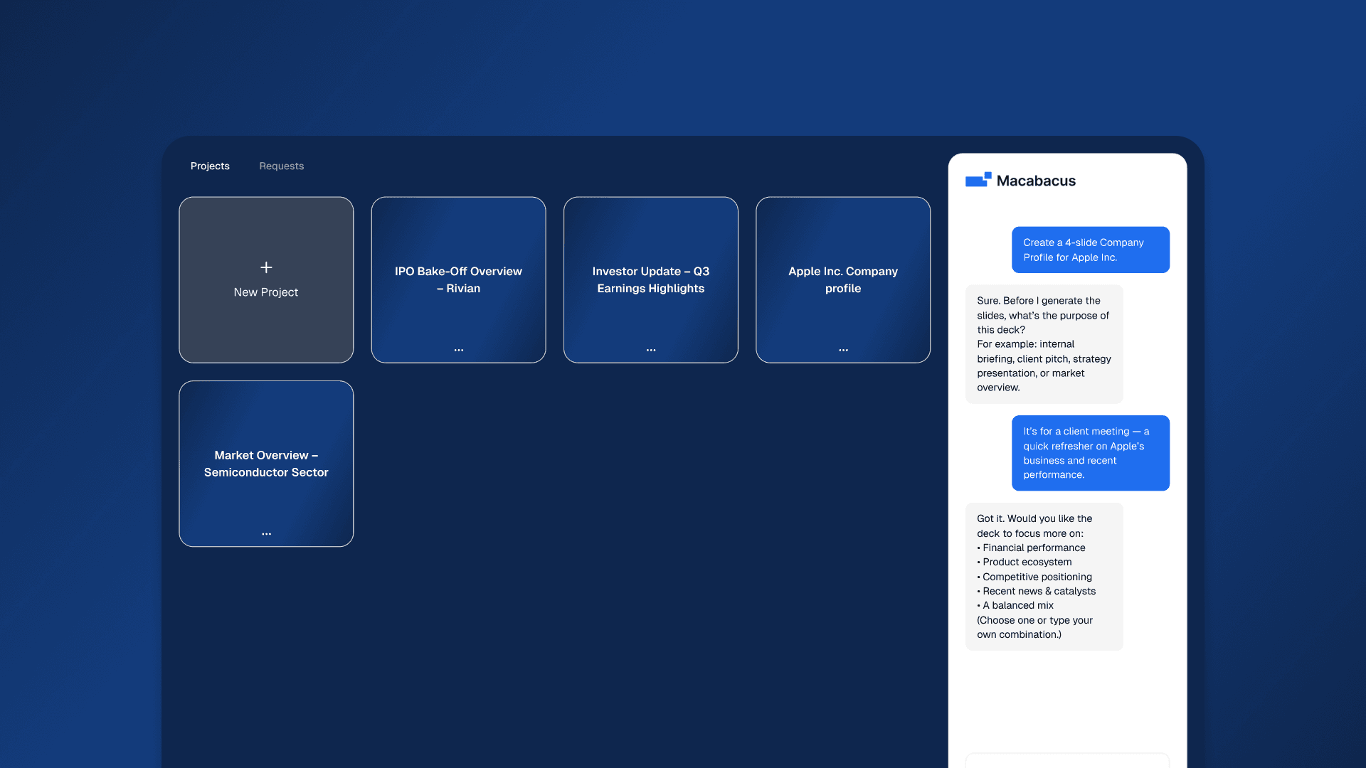 Macabacus is a web-based product designed to generate financial presentation slides with AI. It supports the full workflow from inputting a brief and key assumptions to producing a structured deck, with controls for reviewing, editing, and regenerating presentations. The project focused on improving the clarity and reliability of core flows such as request setup, slide creation, versioning, preview, and export, ensuring outputs are consistent and suitable for professional use.
