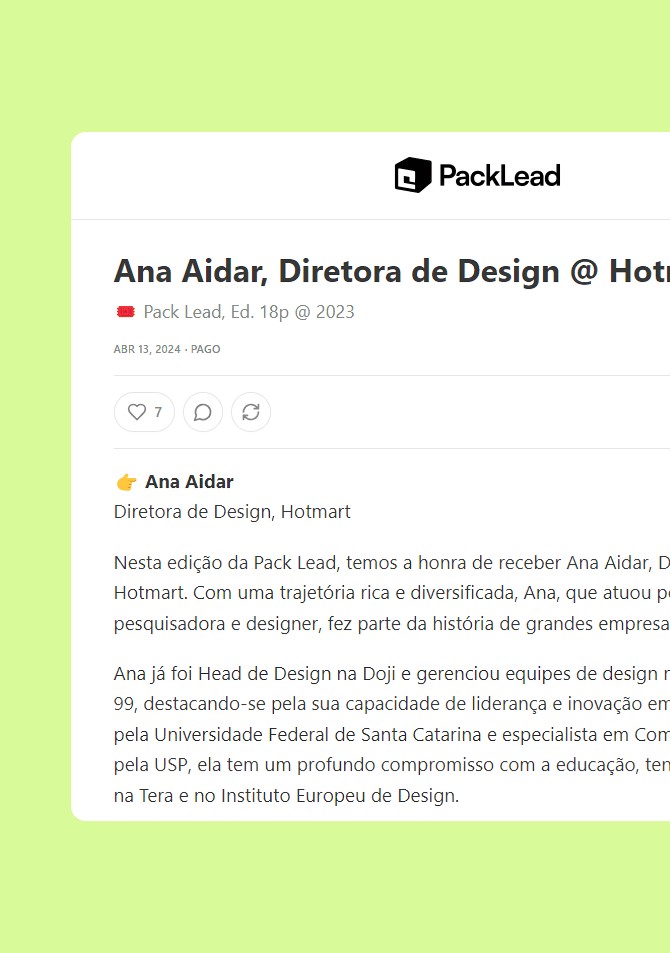 Packlead is the Kakau Fonseca’s design leadership newsletter. I developed the full graphic system, including typography, color, and modular layouts for covers, sections, and social assets, so each edition feels cohesive, scalable, and instantly identifiable.